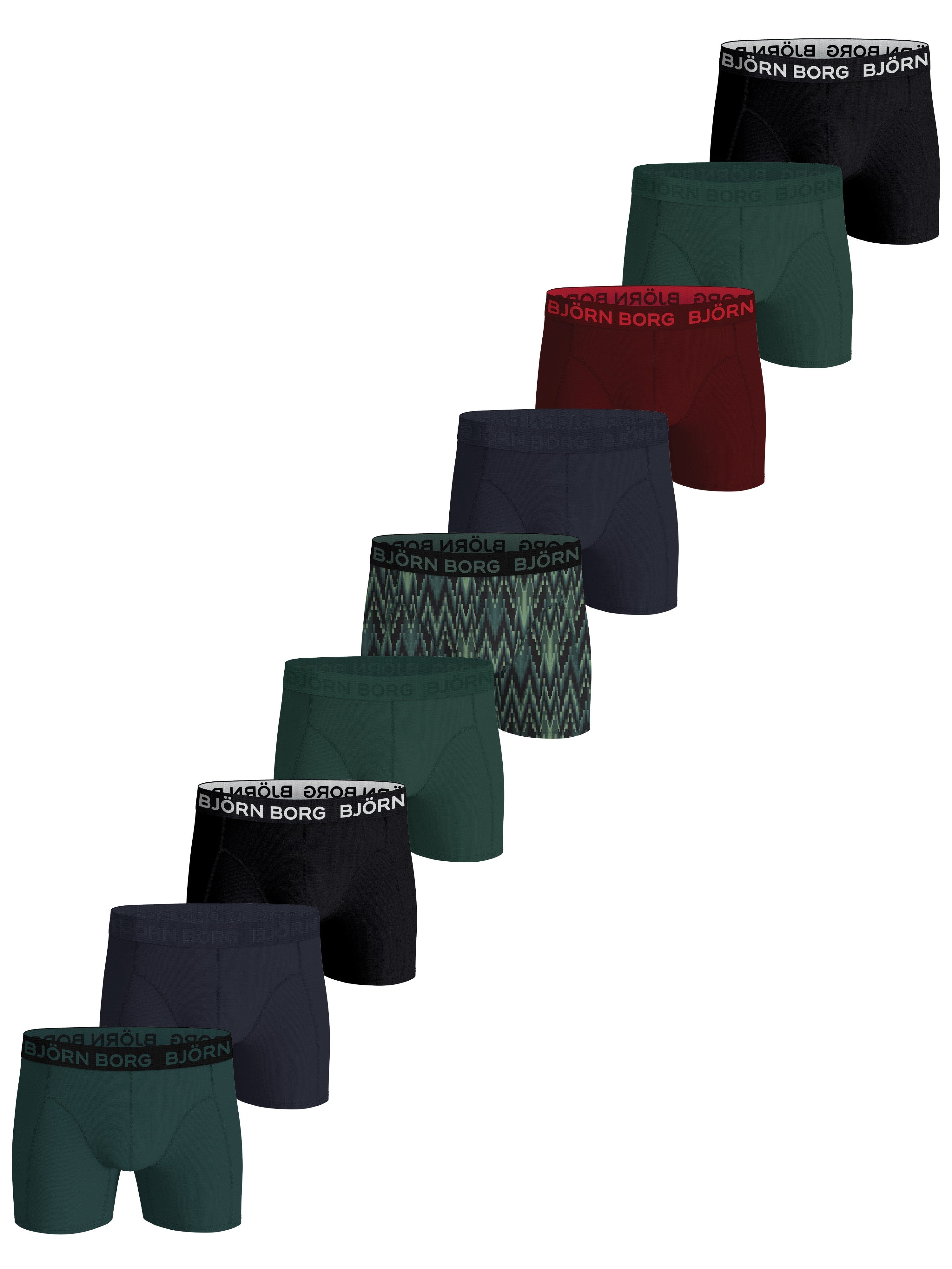 A stylish 9-pack of Björn Borg Cotton Stretch Boxers in various colors. Made from soft cotton jersey, they have a mid-rise waist with a medium leg length. With a panel on the crotch for stability, and a thin, iconic signature waistband in soft elastic microfiber for extra comfort.