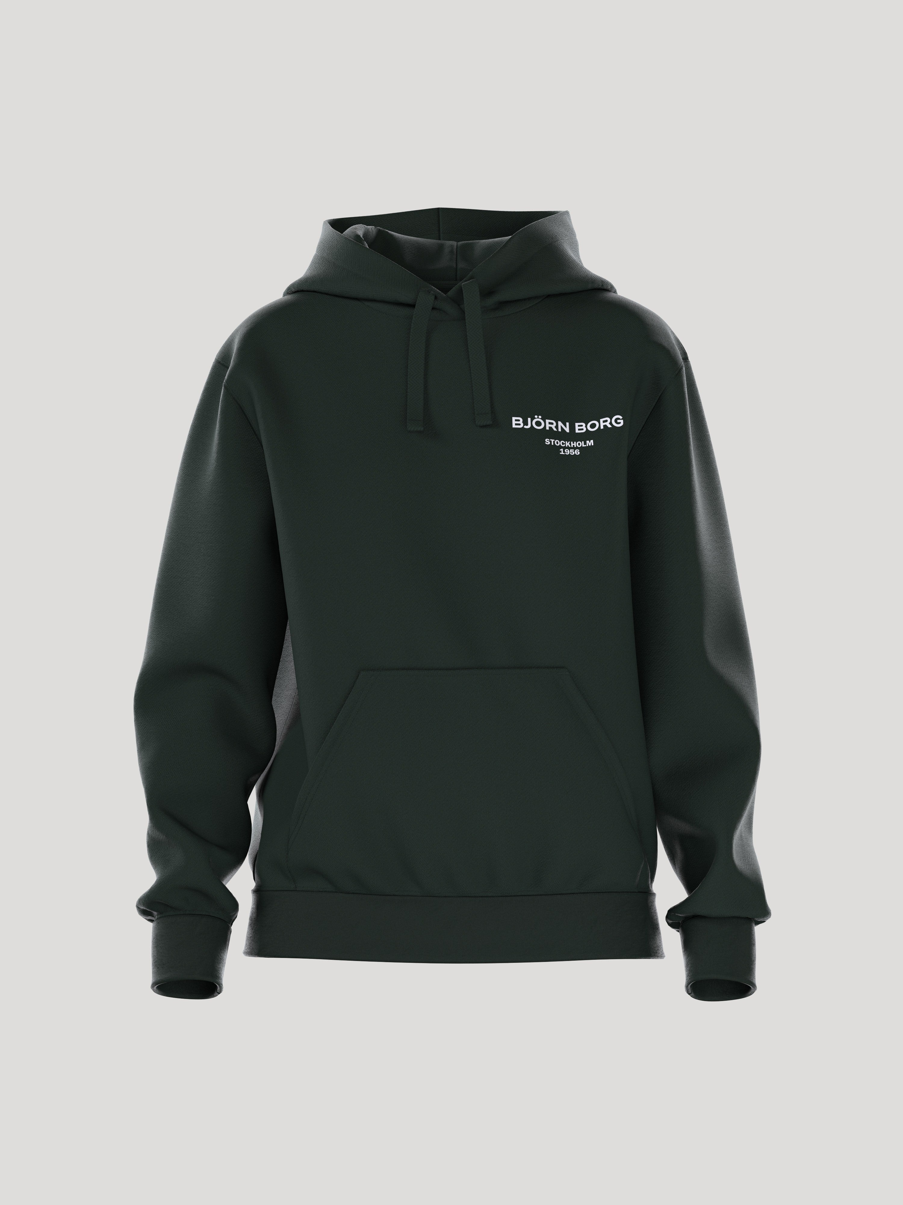 The Björn Borg Essential 1 Hoodie in black is made from soft cotton and recycled polyester fleece quality fabric. It comes in a loose fit with a double layer hood with adjustable drawstrings inside. Featuring a front open pocket for convenience and a small logo print on the chest.