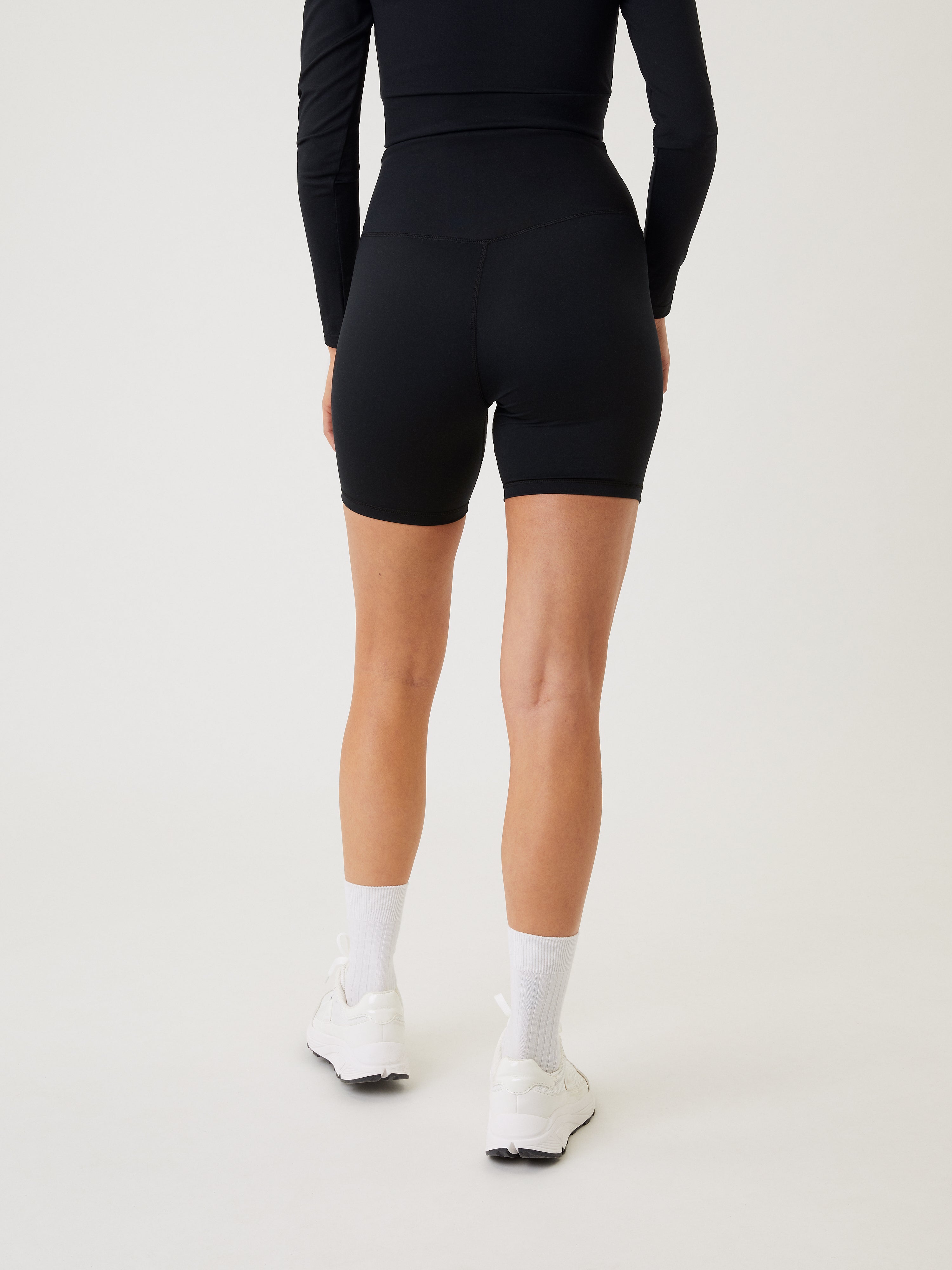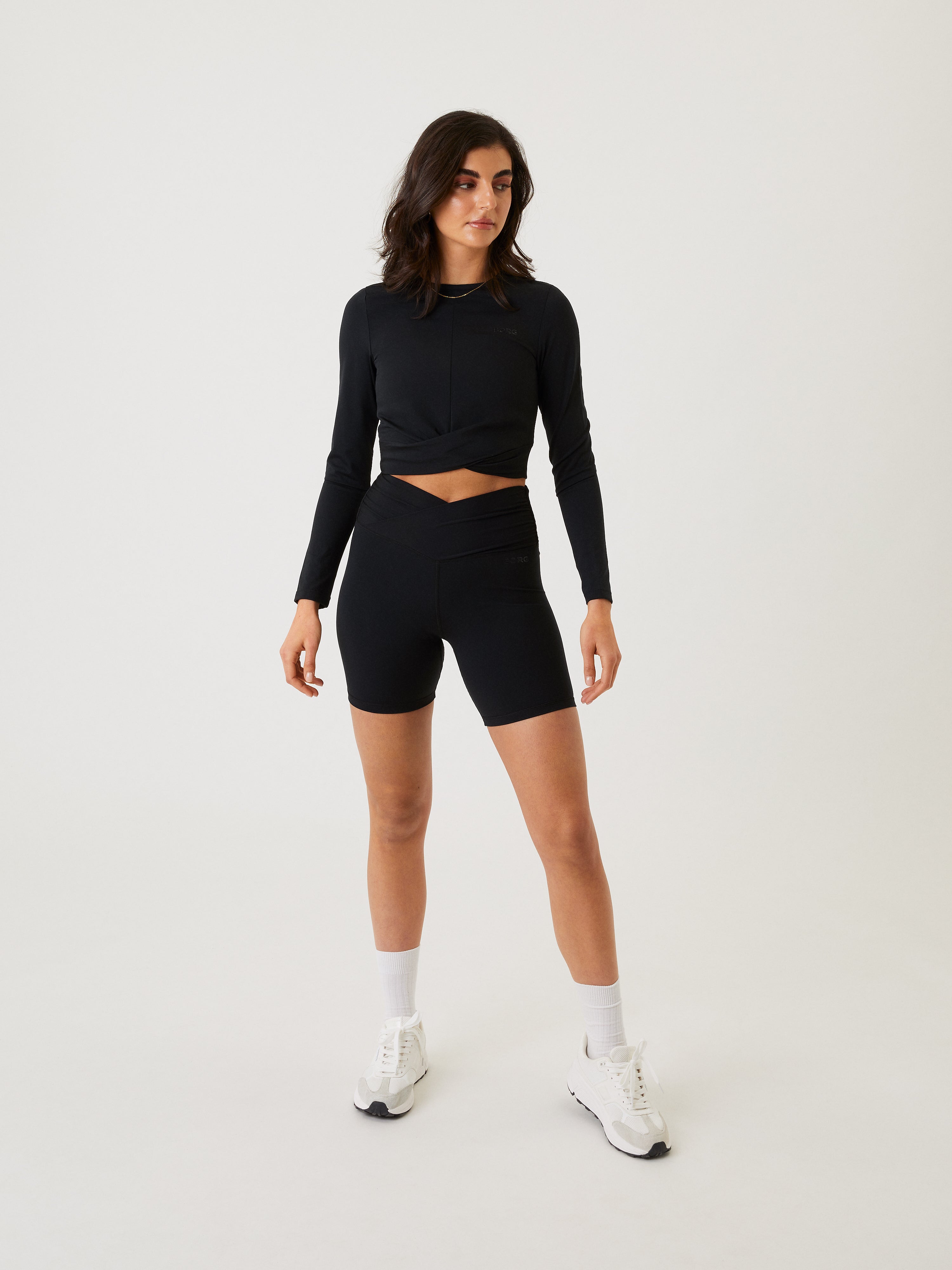 The Björn Borg Studio Cross Shorts are gym shorts for women made from stretchy recycled polyamide quality fabric in soft jersey. They’re short length with a high waist, and feature an overlap detail at the front of the waistband. With a broader waist for great support, a small pocket at the centre back for your phone, and a subtle Borg print on the hip.