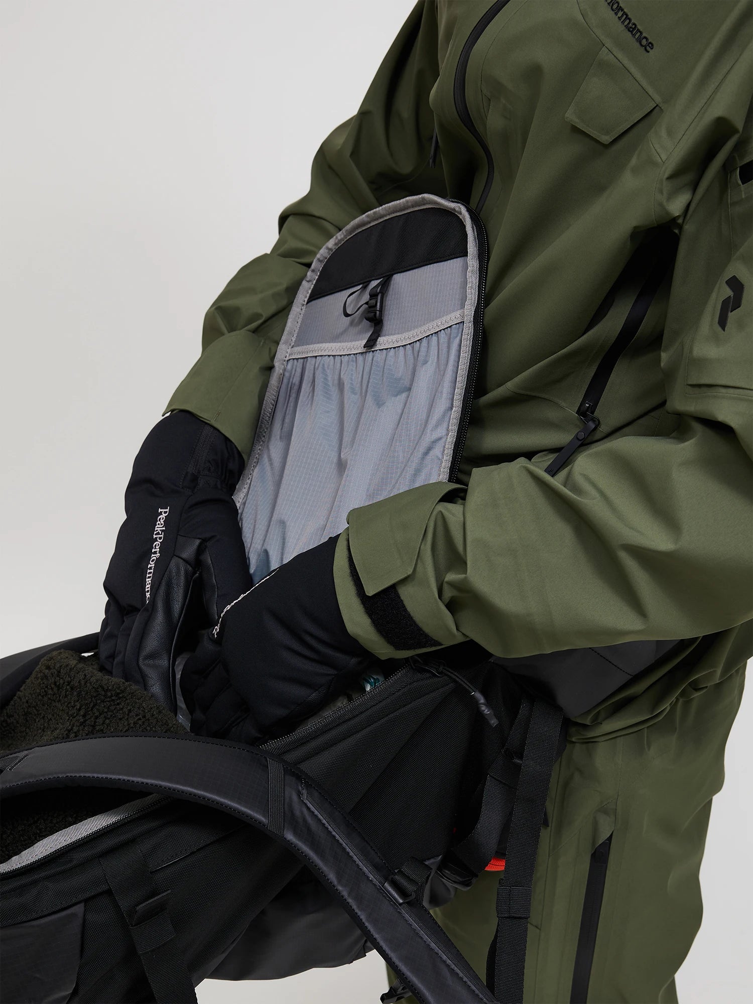 This is the slightly larger version of our ultimate freeride backpack. Side straps allow you to choose between carrying your skis diagonally or A-frame, while the padded back ensures your comfort. The main compartment features a small inner zipped pocket with a key loop as well as a water-bottle sleeve and a large water-bladder compartment with openings for the tube. The waist belt has a smaller pocket for a phone or snacks and features loops for hanging gloves. The medium-sized front pocket can be opened from either side, so it can double as a sleeve for hanging a jacket or ropes. The top pocket is for goggles, the bottom pocket holds all your safety gear, and a mesh helmet sleeve can be pulled out.