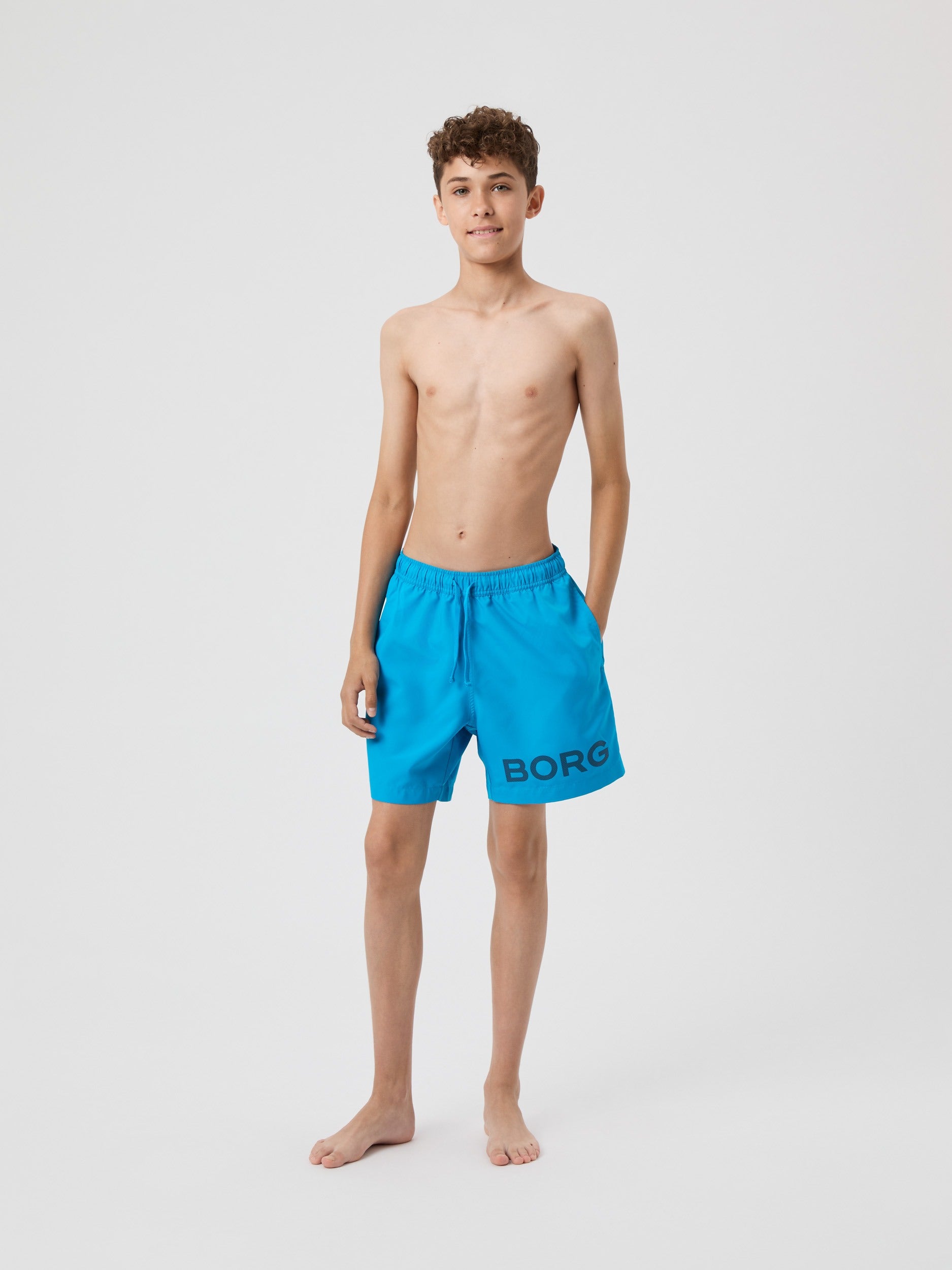 The Björn Borg Borg Swim Shorts for kids are made from recycled 100% polyester treated with a wicking function for a quicker dry. They come in a regular fit and feature mesh inner pants, two pockets on the sides, and a Velcro back pocket to keep their belongings safe. With an elastic and drawcord around the waist for easy adjustment and a large, classic Borg print on the leg.
