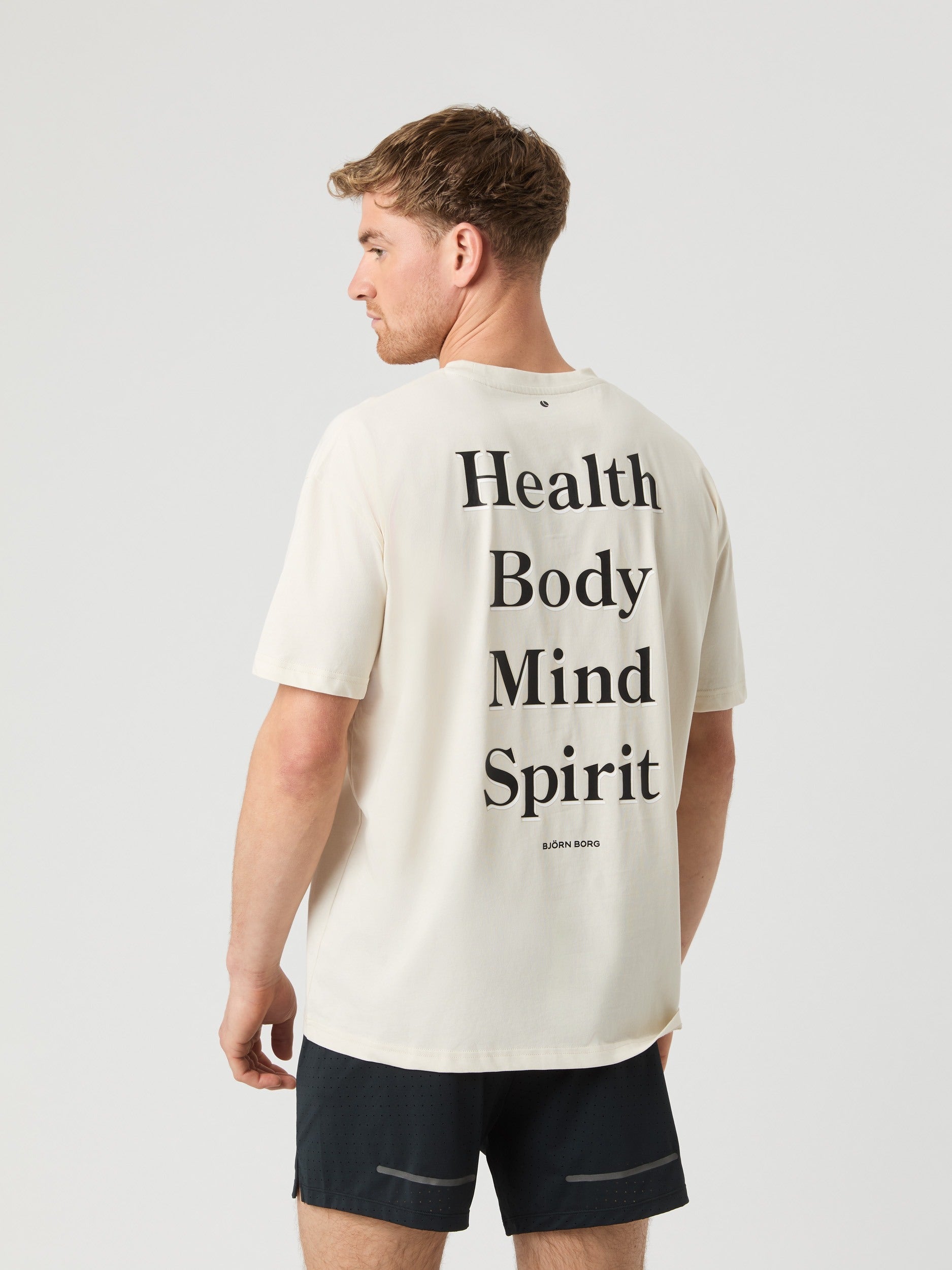 The Björn Borg Borg Gym Oversized T-Shirt for men is made from a soft blend of cotton and recycled polyester quality fabric. It has a loose, oversized fit, a round neck, a small logo print on the chest and a large graphic print on the back.