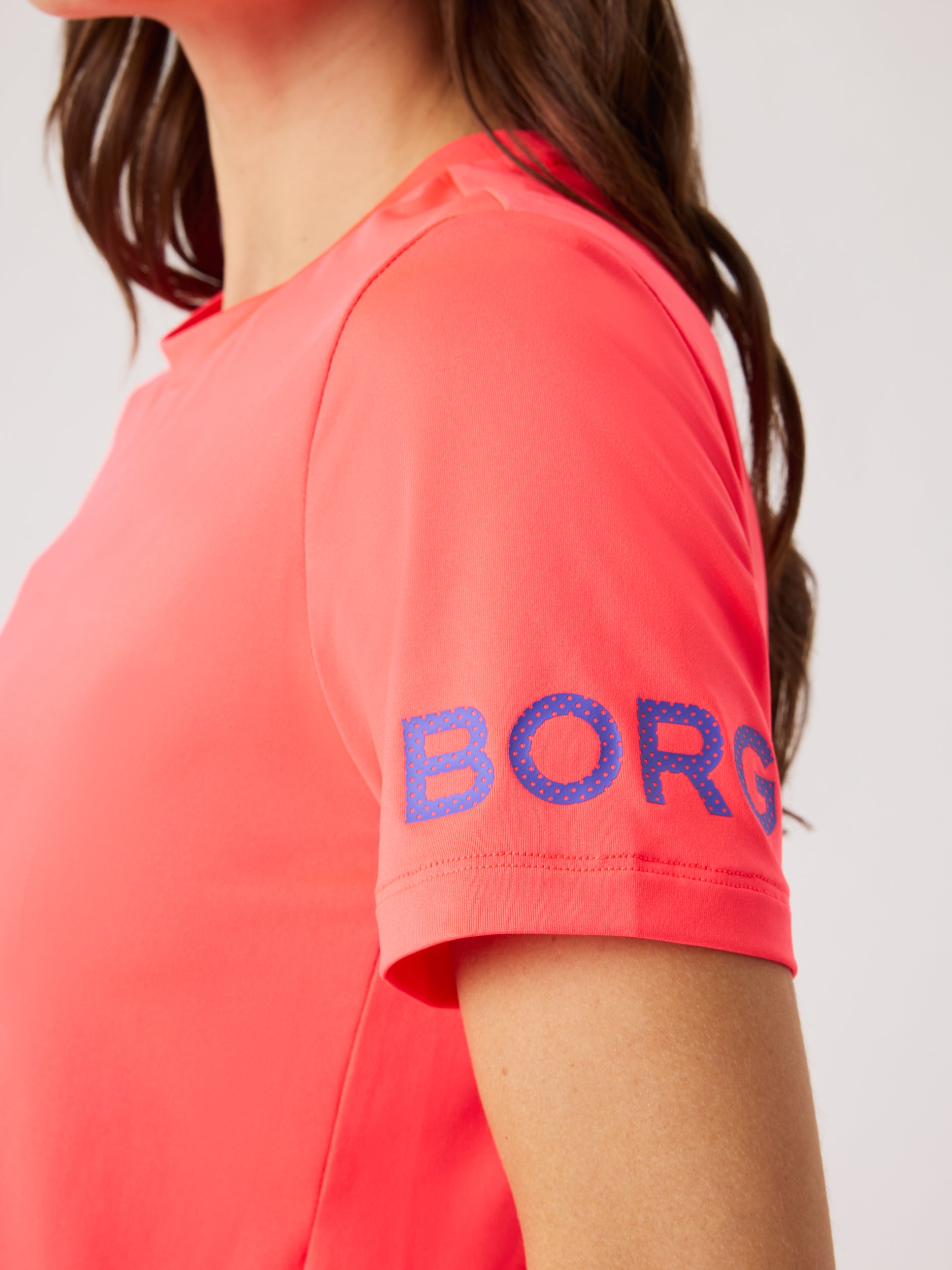 The Björn Borg Borg T-shirt for women is made from soft recycled polyester stretch quality fabric. It comes in a regular fit and features a round neck, slits on the sides for enhanced movability, and the classic Borg prints on the arms.