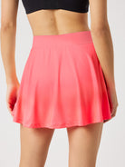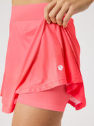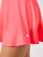 The Björn Borg Ace Jersey Skirt in Diva Pink is crafted from recycled polyester stretch in soft rib fabric. This women's tennis skirt features a regular waist with a short length design. It includes inner shorts for added comfort and a branded elastic at the waist for secure support during on-court performance.