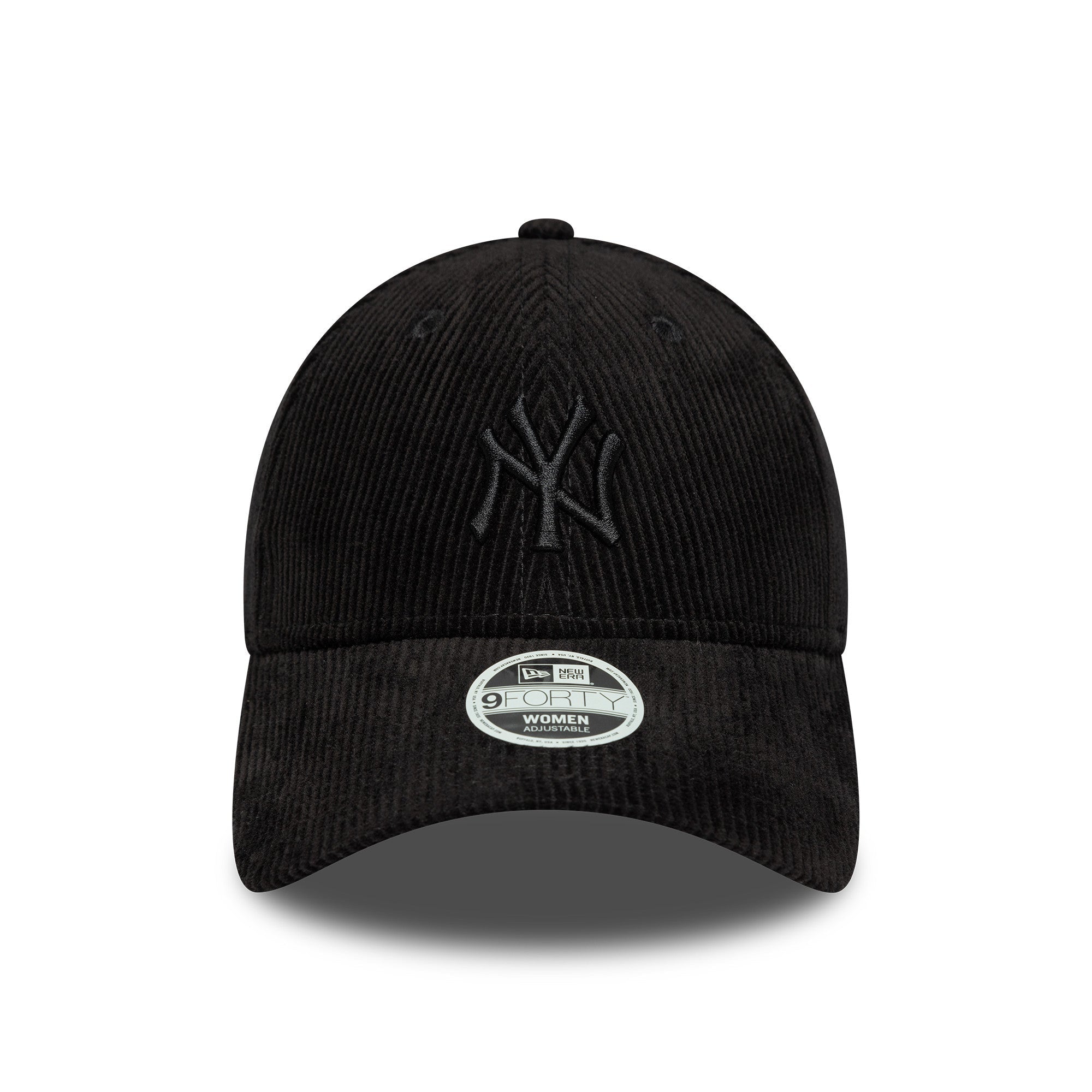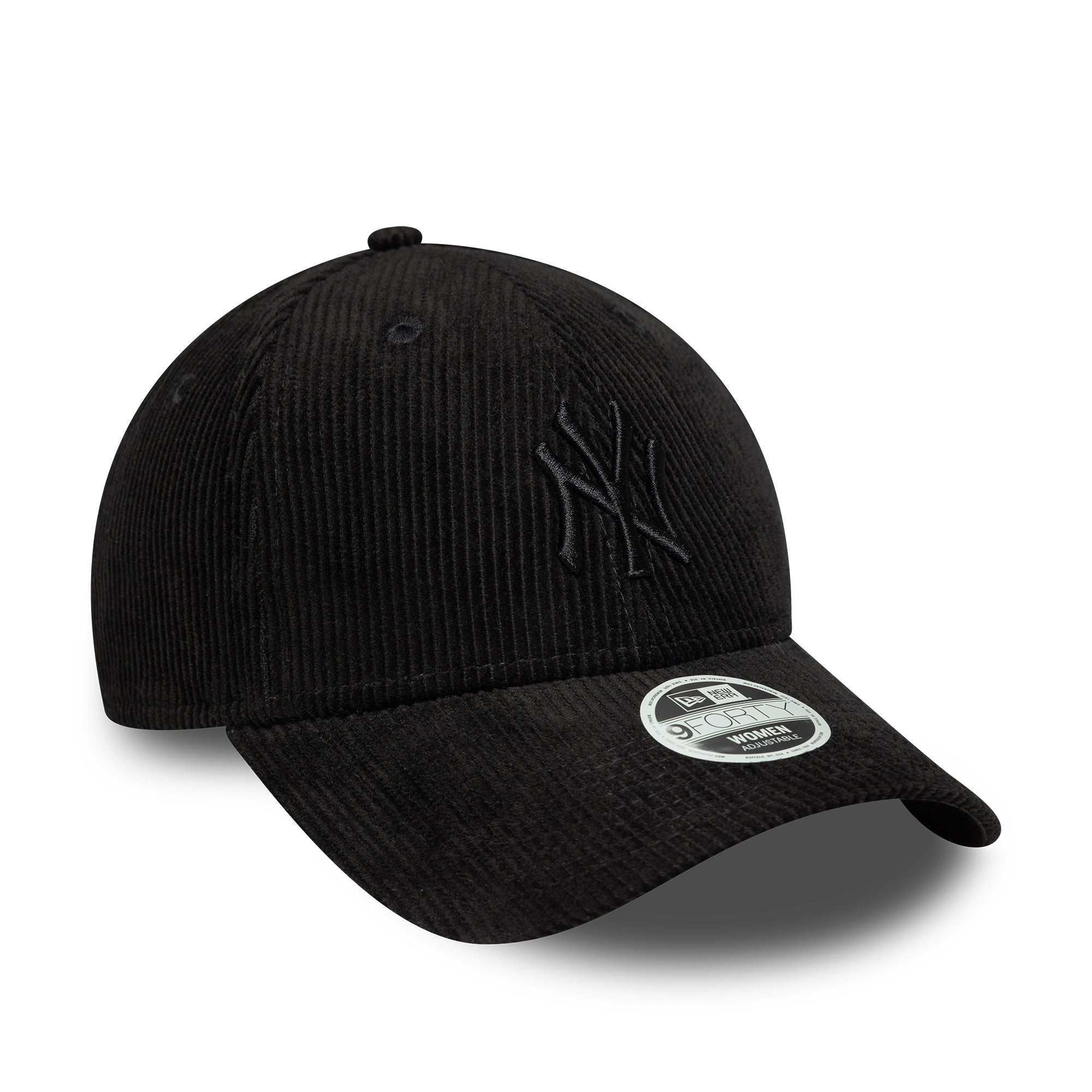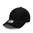 Womens MLB Cord New York Yankees Black 9FORTY Cap New York Yankees logo on front New Era Flag embroidered on left Structured crown Strapback Curved visor Cream undervisor Made with cord fabric