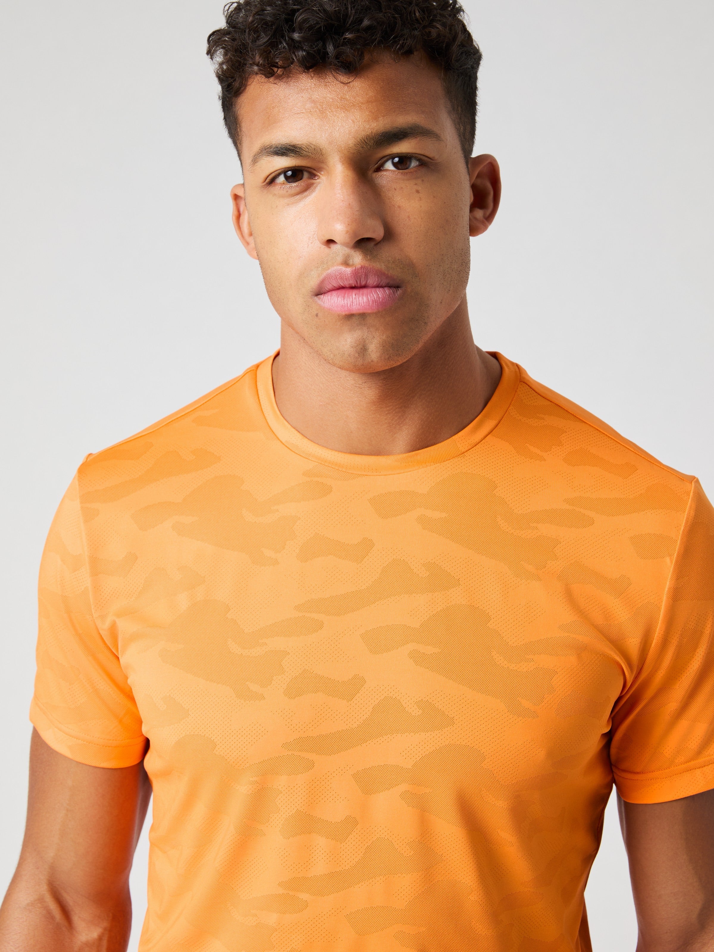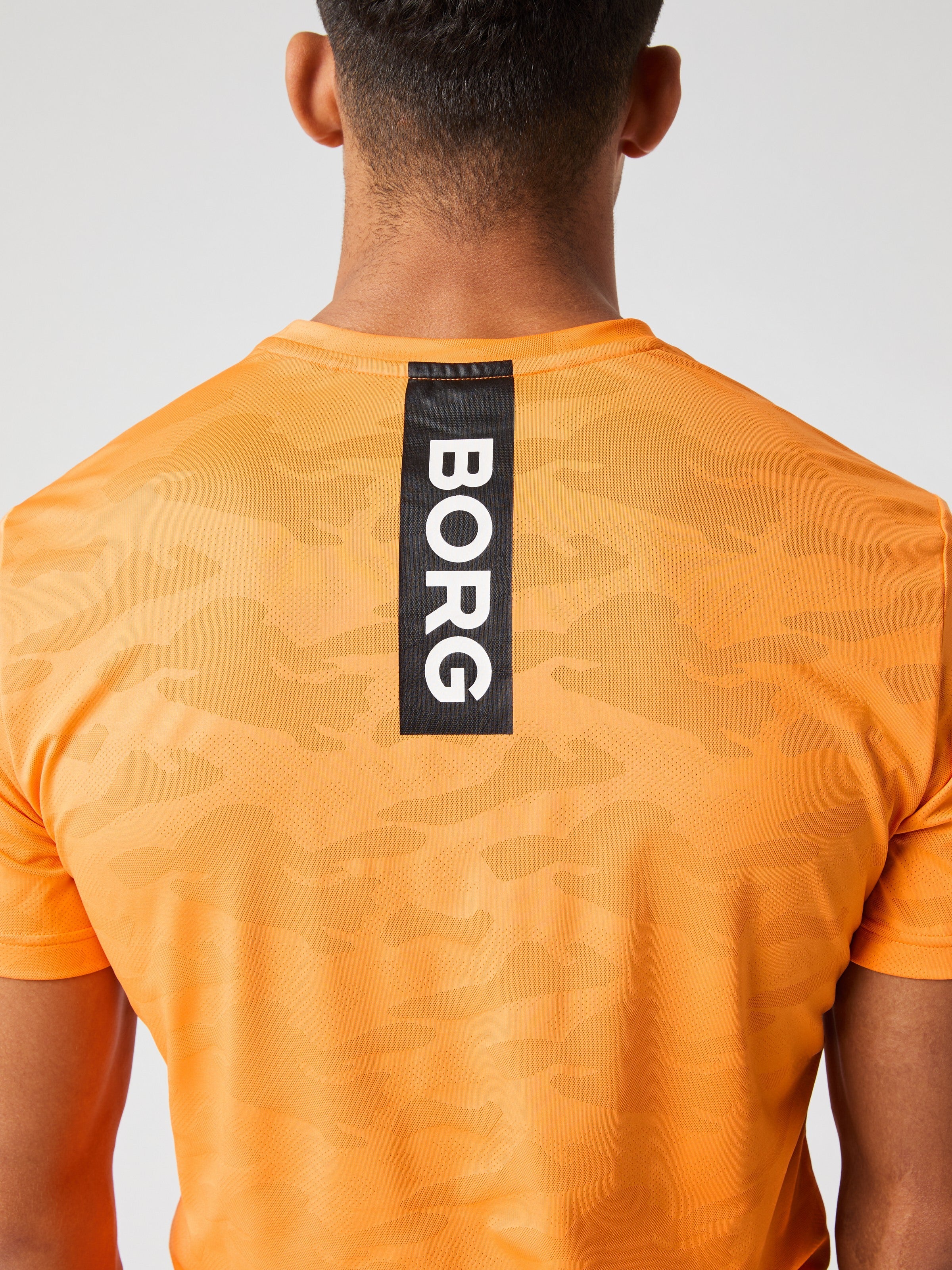 The Björn Borg Borg Performance T-Shirt for men made from soft recycled polyester stretch in a jacquard-knitted camo fabric. It comes in a regular fit and features a round neck and a stripe logo detail on the back with the Borg logo.
